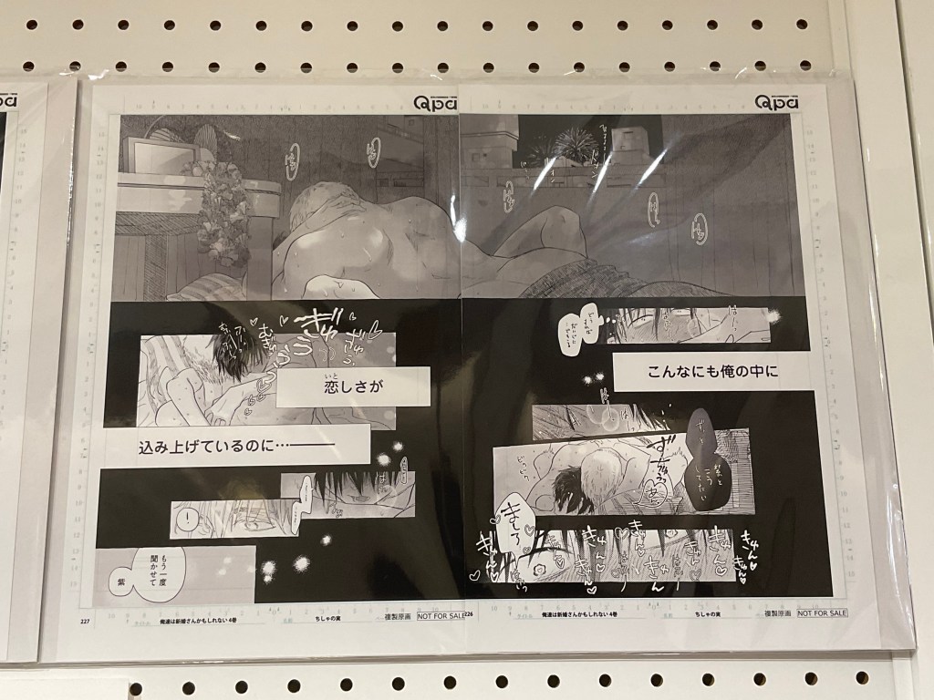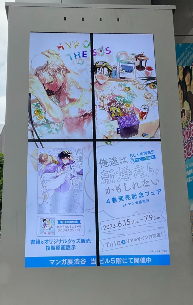 One artist who’s making waves in the BL community right now is Chishanomi, with the release of volume 4 of their hit series Maybe We’re Newlyweds (Japanese title Oretachi ha Shinkon san kamo shirenai). To celebrate its release, along with the 10-year anniversary of Chishanomi’s debut as a mangaka, a special event, including a manga art exhibition and pop-up store, dedicated to the series is being held at Manga10 in Shibuya’s Magnet department store. (It’s also being held in Taiwan, which just goes to show how much international renown Chishanomi-sensei has gained over their 10-year career!)