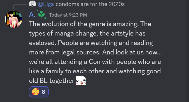 There was a plethora of channels in the Discord server where people could hang out — there were dedicated chats for people to show off their customized virtual badges, share their cosplay pics, and talk about just about everything related to BL under the sun.