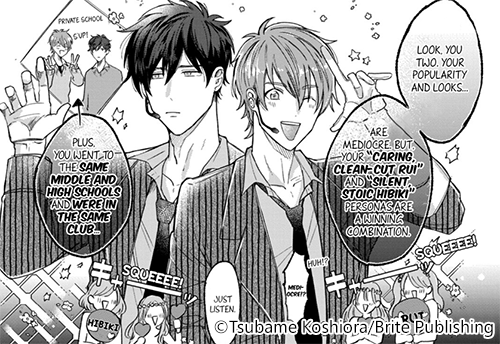 While their relationship originally starts out as merely sexual, accidentally turned on to the idea of having sex by how enticing it looks in the doujinshi they read, it then moves to professional, and finally mutually romantic. When their manager, Shinji, walks in on them having sex, he comes up with the brilliant idea that they should sell themselves as a ‘ship’ since, admittedly, most of their fanbase is in it for the cute relationship between the two. As he says: as far as idols go, their looks and talent are mediocre, but their dynamic as a duo is what really sells them.