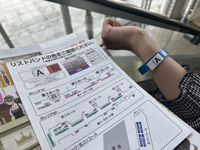 Each wristband was colored in pink, green, orange, or blue, and then marked as A, B, C, or D. Mine was C, so I was sure I was getting in last, whereas Sou’s was A. However, Sou quickly pointed out that the colors seemed to actually matter most, and it was pink who were the closest to the hall, with green (me) coming second, orange third, and blue coming last (r.i.p. Sou). The letters only mattered for where you stood in your color.
