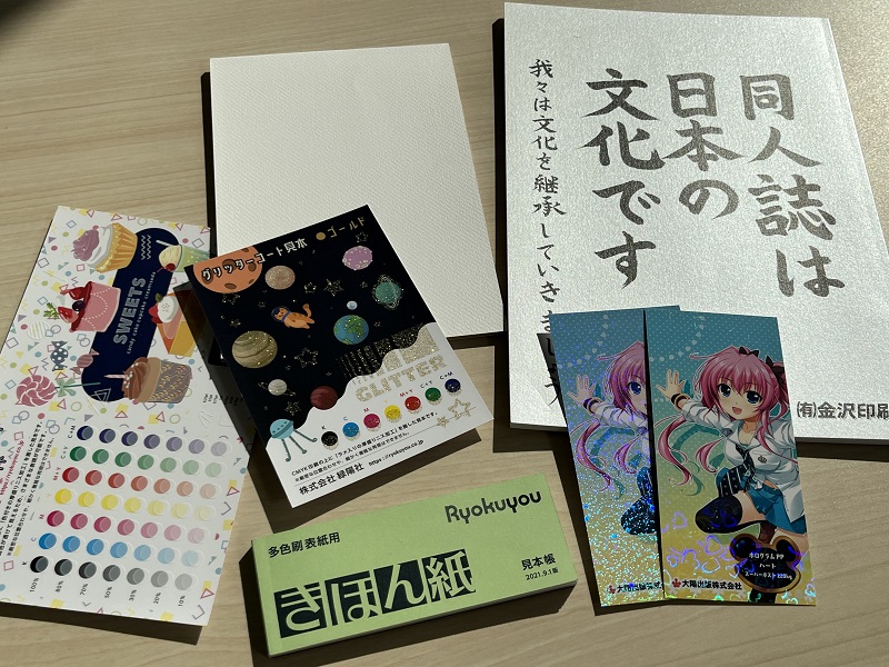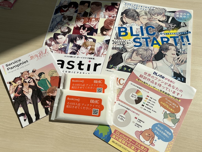As for the other industry booths, there were a handful of booths for digital publishers and hosts like DLsite and BookLive, as well as printing booths for those interested in publishing their own books. These booths usually provide samples of doujinshi paper in a variety of colors and weights, and also showcase color paper for insert pages, different effects for covers, etc. Do you want your cover to have glossy splatters of off-white liquid? Well, they have an option for that, and a whole postcard showcasing how the splatters will look on a variety of colors. Want shimmery star print? Glossy gold lettering? These printers can do everything to make your book stand out!