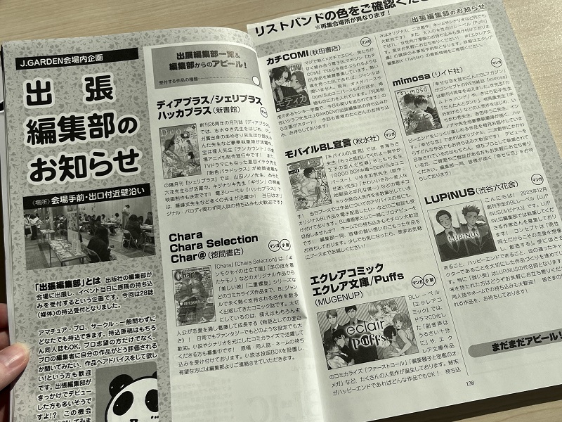 Next to the wall of novels were the industry booths, and behind them was the 出張編集部 (shucchou henshuubu). This section is scattered with publisher booths, each one staffed by two or three of the manga department’s editors. These people come to events with the intention of providing feedback to any aspiring mangaka who hope to go pro someday, and at the same time, if they see someone they find promising, they can scout them. An artist can bring their book, and sit with a publisher who’ll look it over with them and point out what their strengths and weaknesses are. If you’re busy, you can also leave your book at their table and they’ll get back to you with feedback later.