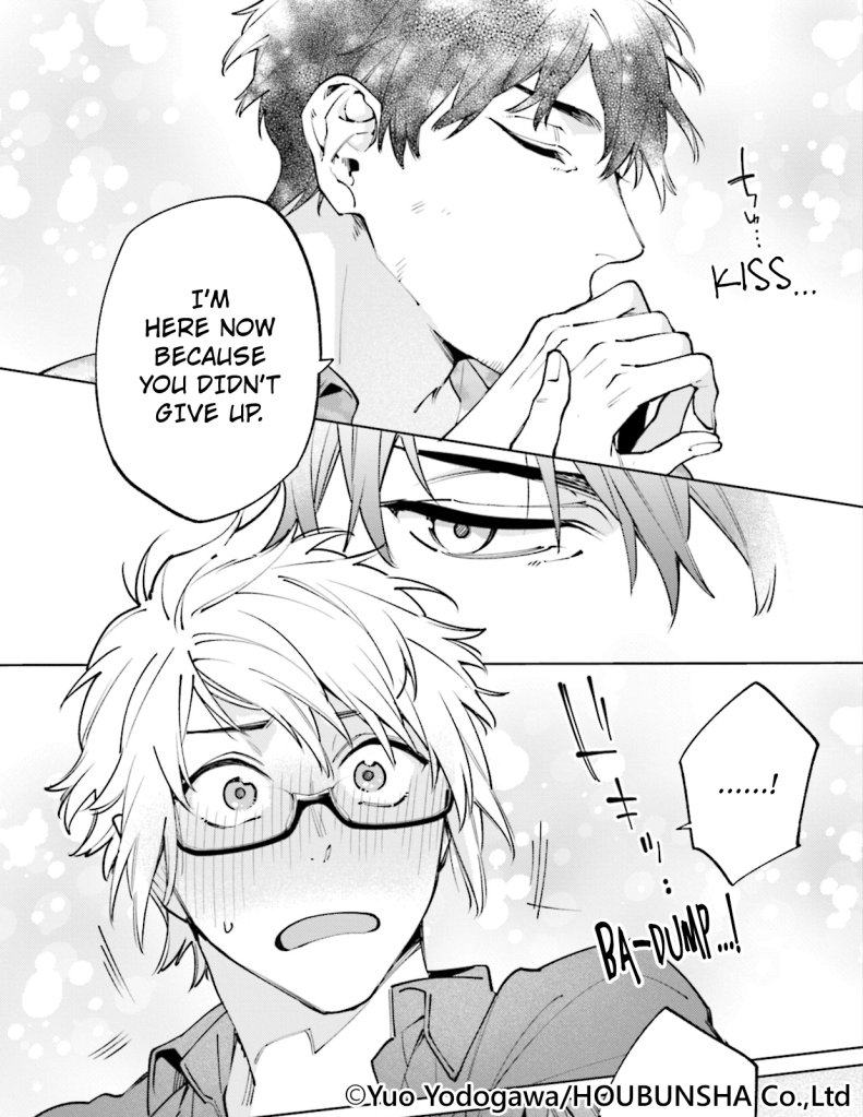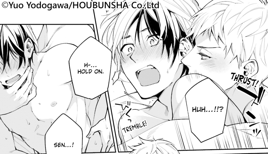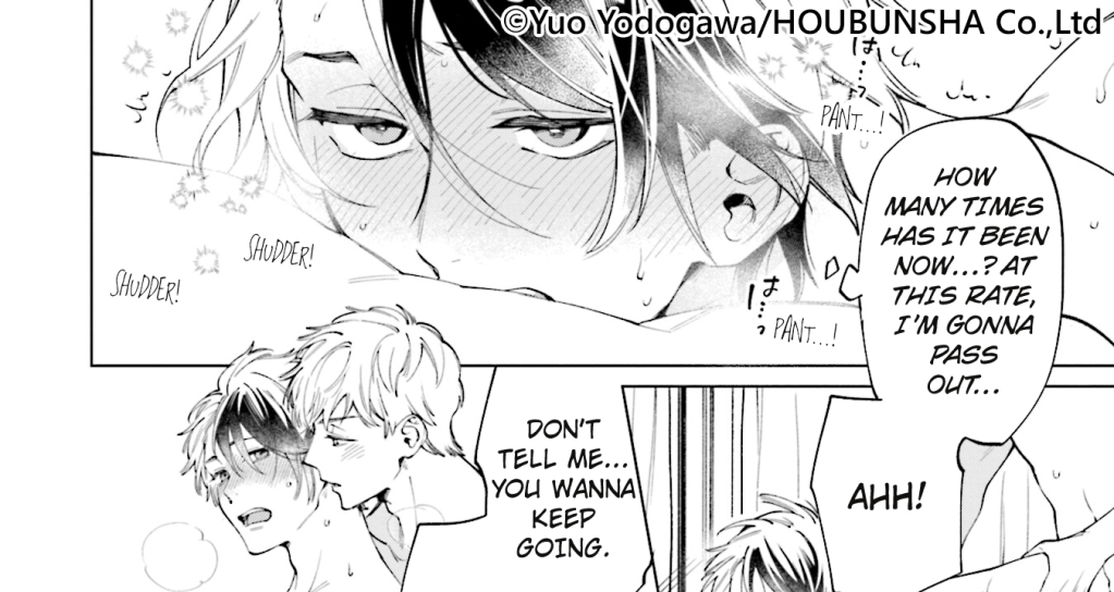 I really can’t get enough of Yuo Yodogawa’s art — especially in the smut scenes. The ukes especially are a delight to look at — I always love to see the bottoms really enjoying themselves during sex, and Yodogawa-sensei has a certain way of drawing their expressions and body language to express not only their pleasure, but the utter joy of being with their partner. Plus, the full-face blushes are adorable.