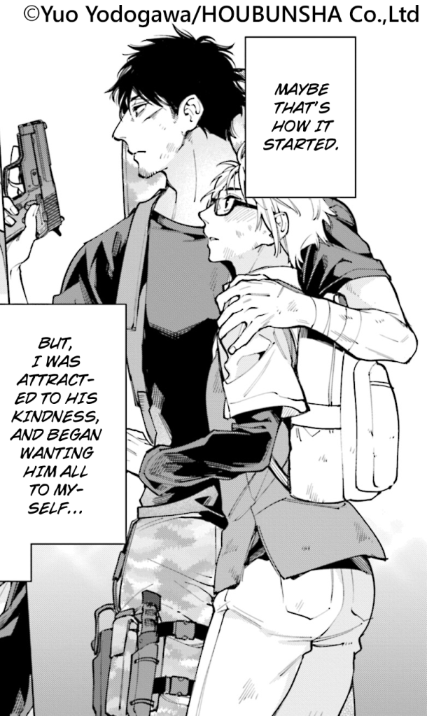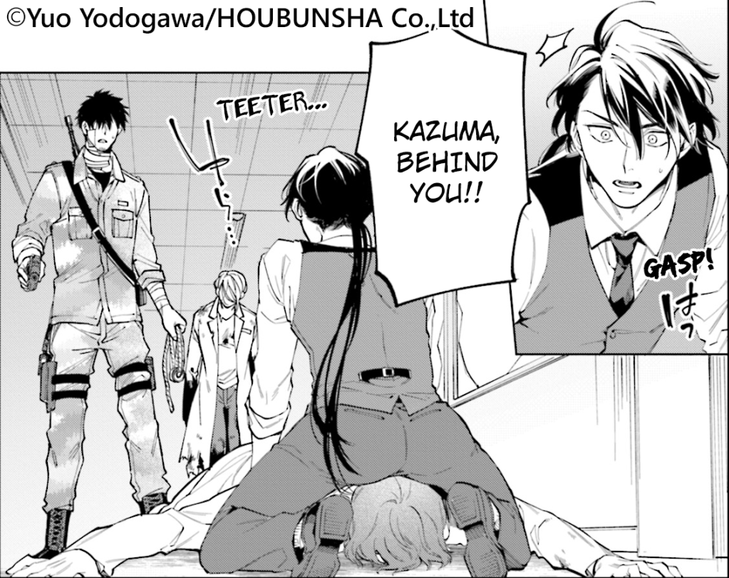 But, don’t think that the author’s careful attention to the zombie apocalypse worldbuilding and depicting the fast-paced action makes the “Boys Love” aspect an afterthought. The romance (and spiciness) between Haruomi and Kazuma is the heart and soul of this series.