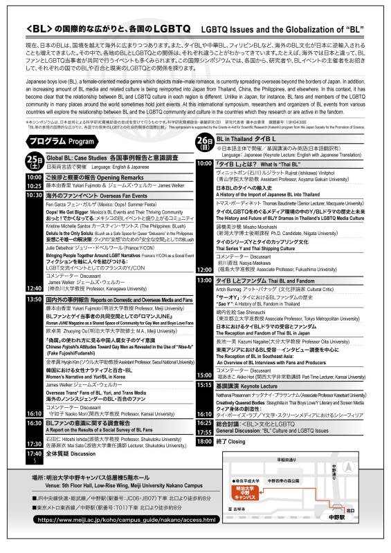 Those are just a handful of the questions discussed at the Meiji University symposium “BLの国際的な広がりと名国のLGBTQ,” or “LGBTQ Issues and the Globalization of ‘BL’.” Hosted by around twenty scholars, academics, fans, and community members from around the world, this symposium aimed to share research around how global queer communities interact with and shape BL in their own image post-import.