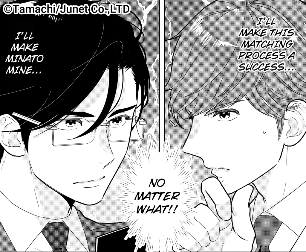 The protagonist of this story is Minato, a professional matchmaker, who is extremely good at his job but has terrible luck with the female clients he’s been assigned (they all fall for him instead). He attempts to circumvent this by adopting a “male clients only” policy, and who walks in as his first matchee but Akihi, a successful and handsome businessman.