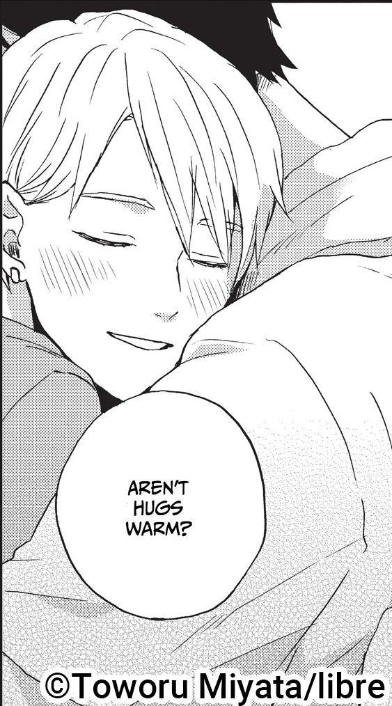 After this strange night together, Kiichi finds himself inviting Nao over again for more “hug therapy” sessions. This unusual platonic relationship is strangely addicting for Kiichi, who enjoys Nao’s companionship more than he expected. He’s touch-starved, but reserved and polite, making him easy to root for.