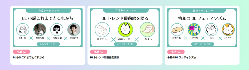While I would have loved to bring my friend Merry (interviewed on the BLog here), she was unable to come. So, I was thinking I’d go alone—until I brought it up with Sou. Since they’re also a huge fan of Kishimoto-sensei (we discuss her adorable tweets regularly), they said they’d be interested in coming with. Thus, I requested two tickets each for “Discussing the Frontlines of BL Trends” (BLトレンド最前線を語る) featuring Kishimoto, Satou Sugar, and Teku Rin, and “BL Fetishism in the Reiwa Era” (令和のBLフェティシズム) featuring Okita Yuuho, Nikuya Inui, bov, and Yukiharu.