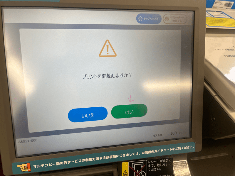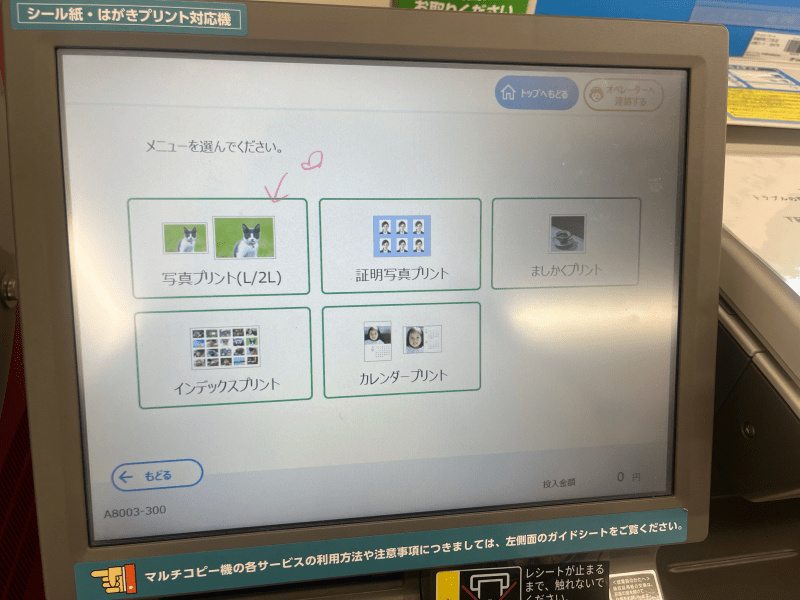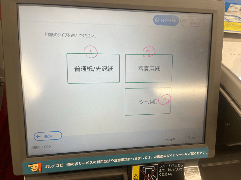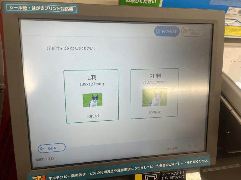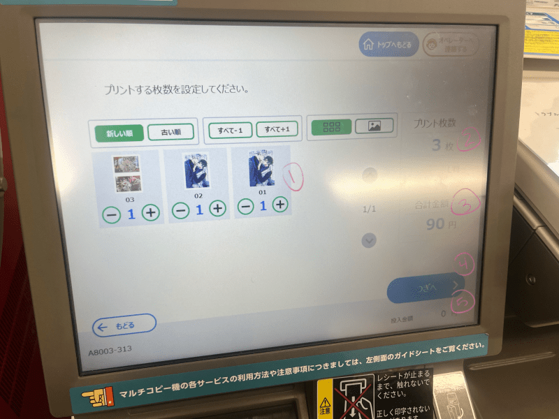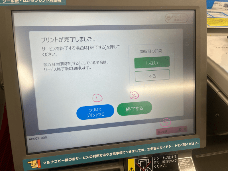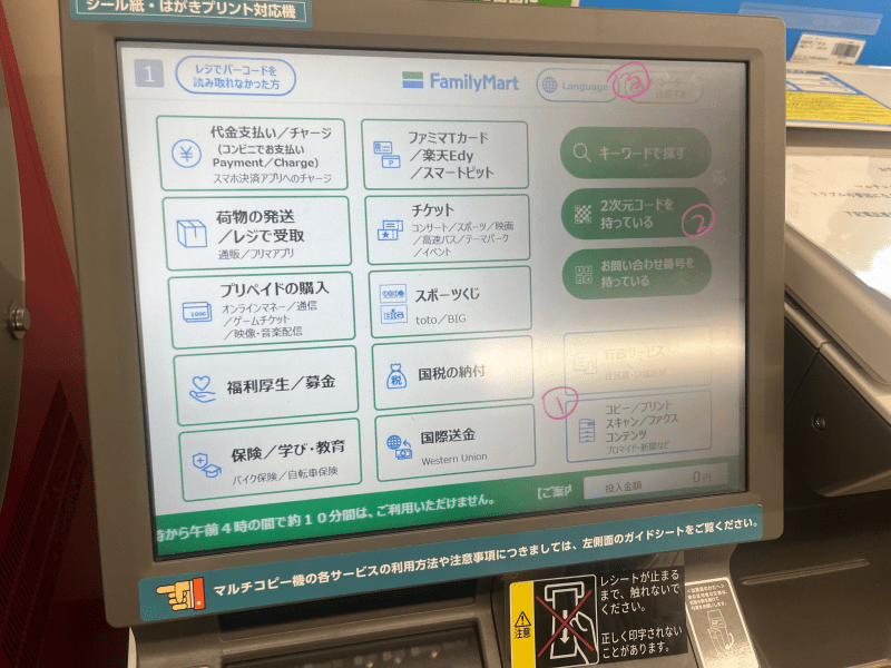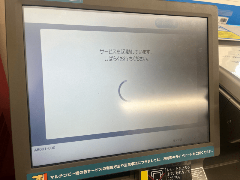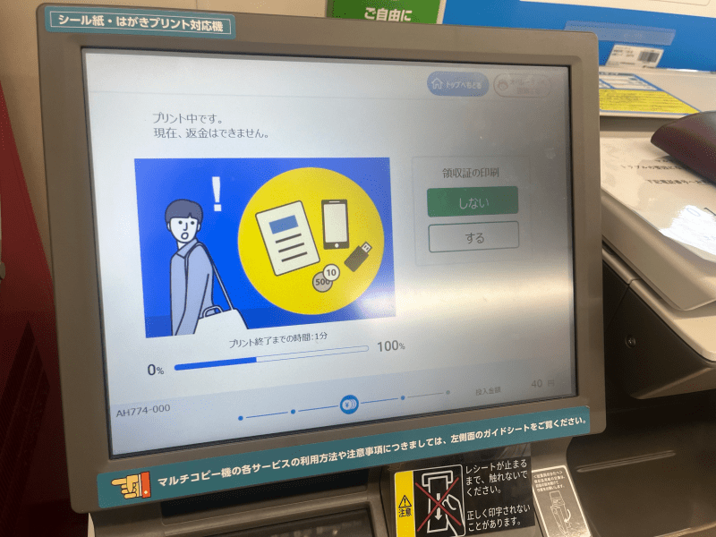 The wait screen. Photo prints usually don’t take too long (maybe 30 seconds per photo) but stickers tend to take a bit longer. I’ve never printed a postcard at Family Mart (only at 7-ELEVEN) but I can only assume they don’t take any longer than photos.