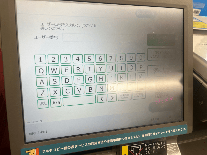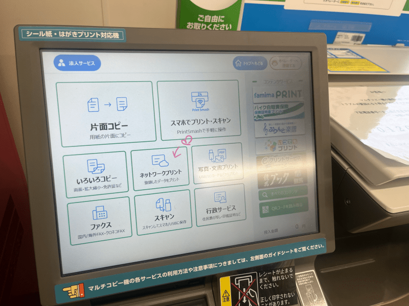 This is the main screen of a Family Mart printer. Sometimes each printer has a slightly different screen layout, but generally speaking you’ll want to go for whatever says print (プリント). On this screen: