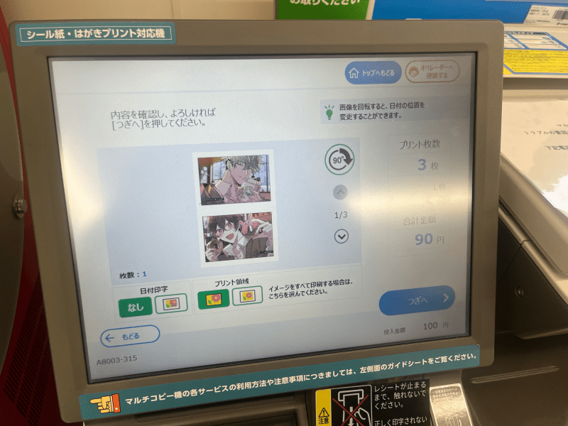 When we were discussing this BLog post during our team meeting while looking at the B+Library Net Print catalogue, our own dear Takochan asked “…aren’t those embarrassing to print in public?” But they don’t have to be—the screen is only visible to you and the photos stack in their little private print dispenser, so there’s not really anything to be shy about. People expect to see all walks of life at the conbini, and being a fujoshi isn’t seen at that shameful in Japan anyway, so no one’s going to care what you’re printing. I’m sure they’ve seen way worse standing next to random ojisan on public transit. Still, it’s polite to not flash the boy tiddies around too much.