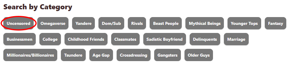 3. If you scroll down a bit, you’ll find our “Search by Category” section. Find the “Uncensored” button, and click to go to the search page for all our BL manga that’s tagged “Uncensored.”