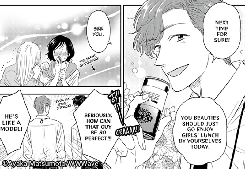 Enter Fukami, a coworker from the tech department at Kaji’s company. Fukami is frumpy, unsociable, and bland, hiding behind uncut hair and thick glasses. Thus, when he’s paired with with Fukami for an overnight business trip to clear up a bug in another prefecture’s system, Kaji’s incredibly judgmental. While they’re on their business trip, Kaji secretly leers at Fukami and rates him a “total 0.” However, at the hotel that night, Fukami walks out of the shower and—he’s stunning!??? Dressed in the skimpy hotel nightshirt, bare legs in full view, and hair finally out of his face, Fukami is incredibly, 100% Kaji’s type—from 0 to 100 in an instant. So shocked, Kaji drops his phone—leaving the gay hookup app he was previously browsing in full view.