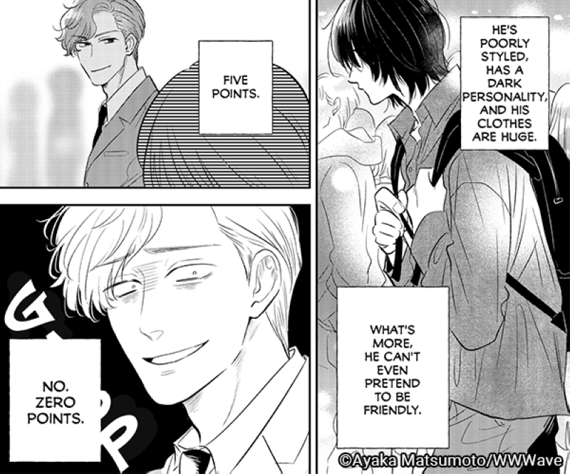 The story follows Kaji. Loved by his coworkers, admired by women on the street, and just overall seen as the pinnacle of capability and manhood, Kaji seems like a great guy. In reality, however, Kaji’s a total piece of shit. He’s arrogant, callous, and incredibly calculating. He fakes his Nice Guy™ personality at the office while looking down on his coworkers, thinks lowly of anyone who isn’t appropriately “attractive” by his standards, and gives every man he sees a score from 0 to 100, judging their worth on their status, style, and looks above all else.