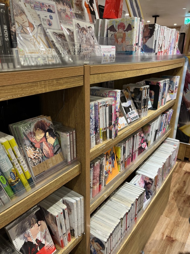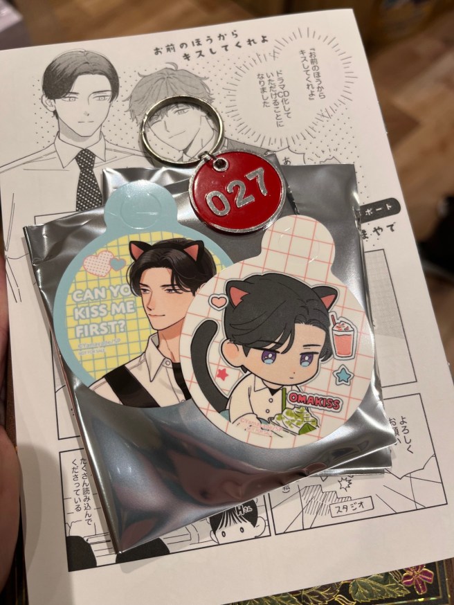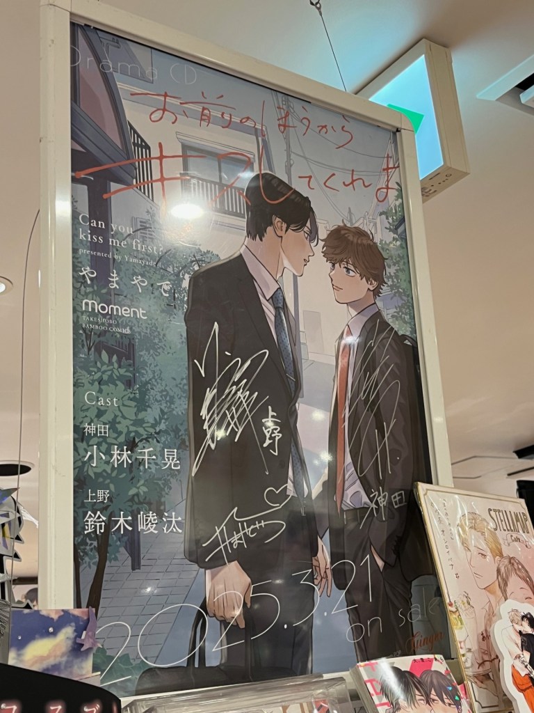 The staff was kind enough to let us go to the sixth floor while we waited for the shop to open, and we were able to chill with the BL goods. Right above us was actually a signed poster by Yamayade of the You Should Be The One To Come Kiss Me tankoubon cover with the drama CD announcement. (And don’t worry, we asked the staff if it’s allowed to post images from within the store, and they said it’s okay as long as there are no customers in the images. Manners over content!)