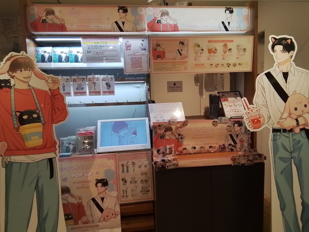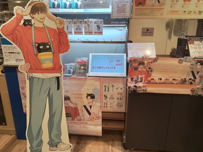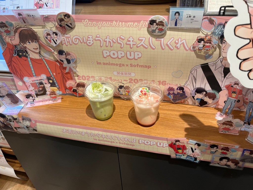 Today, March 21st, the drama CD for Yamayade’s smash hit Omae no Hou kara Kiss Shitekure yo (released on Renta! as You Should Be The One To Come Kiss Me) came out to much fanfare, and in celebration a pop-up shop for the series also opened at Sofmap stores across Japan! In collaboration with the Akihabara location’s STELLAMAP café, which often hosts BL collabs and cafés, there was a drink stand on the sixth floor. Thankfully, our kind boss graciously gave us the go-ahead to take a short work trip to hit up the drink stand and pop-up on opening day, so we’ve decided to post a report!