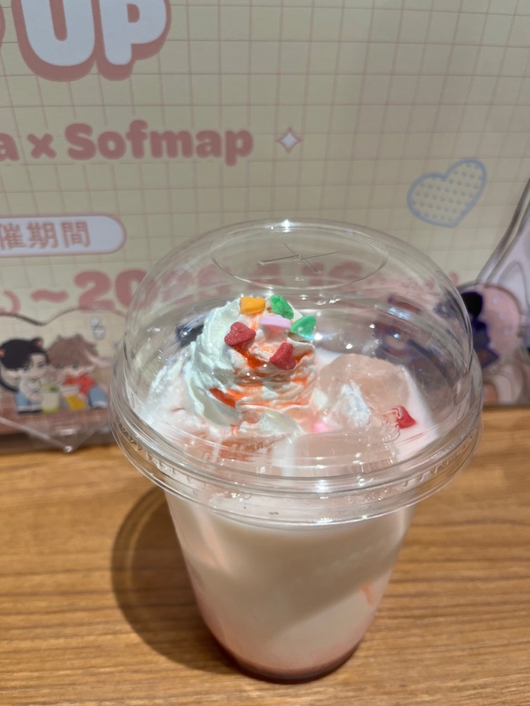 My maccha drink was pretty good. For those who aren’t super into maccha, this is still a great option because the maccha flavor wasn’t super strong or bitter! It also wasn’t as sweet as I was expecting until I got to the point where the whipped cream was melting into the drink. One lady who was passing by saw our drinks and evidently got jealous and asked where we got them, so we pointed her to the sixth floor—though I’m not sure she knew they were from a BL manga collab!