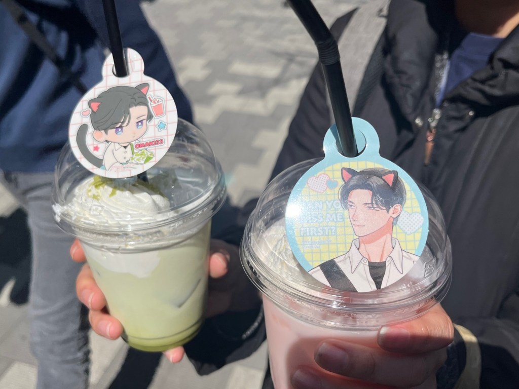 The wait was actually quite long, but that’s okay because it gave us a chance to decide our plan of attack. Since we needed the drink receipt for our work trip, Sou would handle the buying of any “personal” items (goods and CD) while I handled the work purchases (drinks). Unfortunately, there was a limit to how many drinks we could get, so while we originally planned on buying and doing on a write-up on all four, in the end we only got two! I chose the two that looked most appealing without really thinking about it, which ended up being both of Kou’s drinks! Oops. 😭 Sorry, Eito! This also meant I only got Kou’s straw tags. I do love Kou (in fact, I selected him as my favorite seme character of 2024) but I also love Eito so I felt a little let-down by my lack of foresight on this.