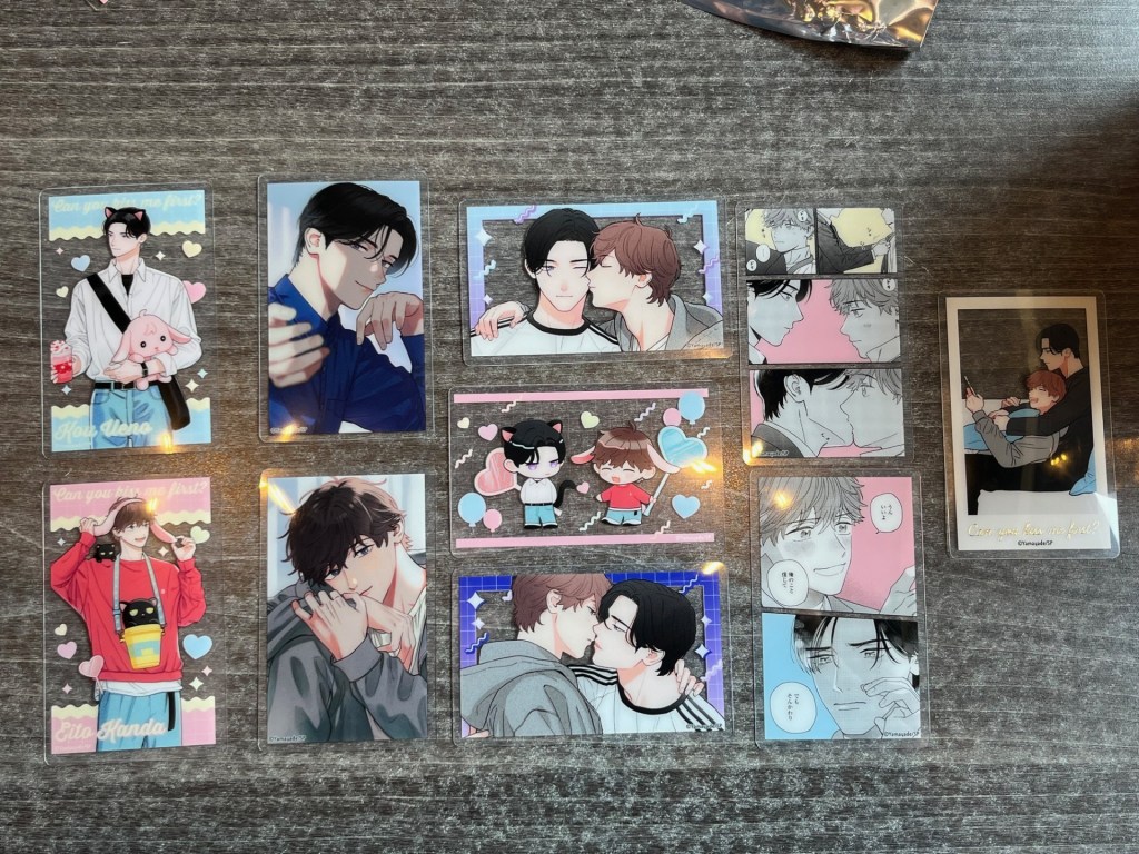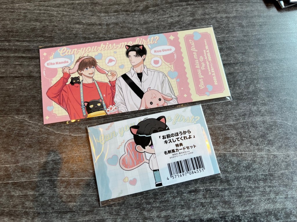 The CD comes in both regular and deluxe edition (titled the “Kiss me more?” set — how adorable is that??), with the latter including an extra CD with bonus tracks and a special booklet that includes a bonus manga, a Q&A with the characters, and other special extras. Plus, there may be little bonuses that vary depending on where you purchase the CD from, so be sure to check out the 特典情報 (“bonus info”) for whatever retailer you’re looking to buy from! For Sofmap, this is a pair of “polaroid-style” cards with a foil-stamped replication of Yamayade-sensei’s signature. I was particularly stoked for this bonus, so I immediately bought a copy from Sofmap while enjoying the pop-up shop and drink stand. And, you know I had to splurge on the “Kiss me more?” deluxe edition for that extra booklet and audio! I’m personally excited to experience this story all over again, with the new addition of voices for the characters I’ve come to love so much.