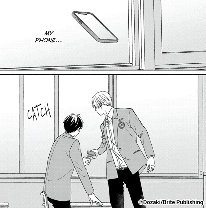 The following day, Jiro approaches Mitsuru and asks him if they can have a chat. To Mitsuru’s surprise, Jiro not only hasn’t told anyone about Mitsuru, but also comes out to him as gay and asks if they could be friends. At first, this doesn’t sit well with Mitsuru; after all, isn’t it possible that Jiro’s just lying and plans to blackmail him? In addition, back in elementary school, Mitsuru’s been made fun of for acting “cute” and thinking that was a compliment. That incident left an emotional scar for him, driving him to stay within his shell and avoid opening up to others.
